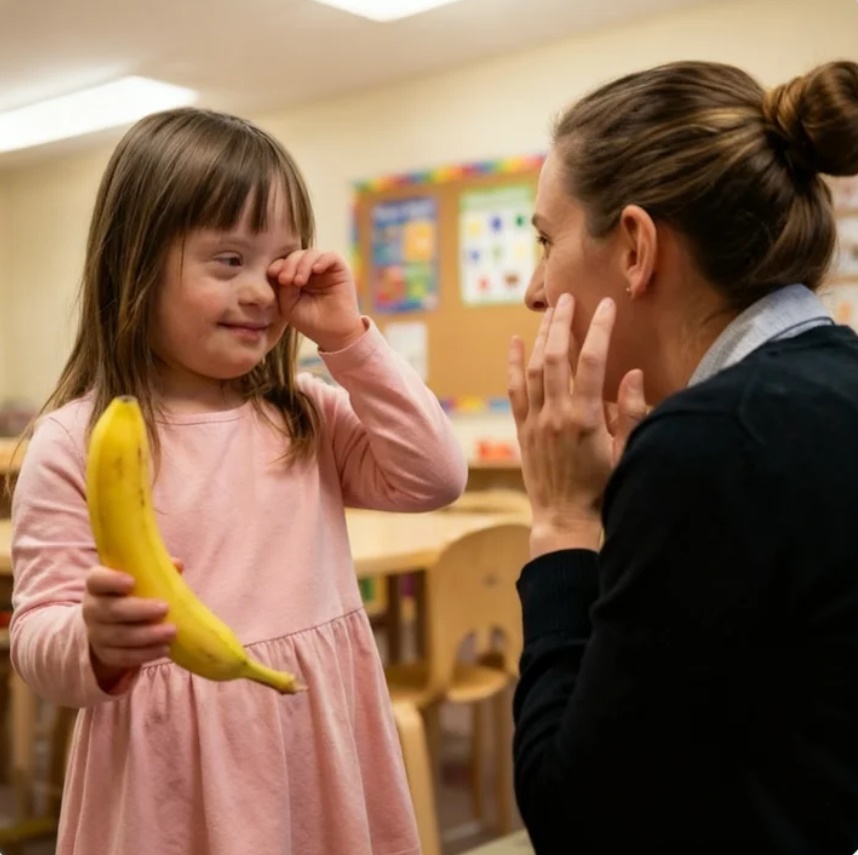 Una niña pequeña le da su único plátano a su maestra. Mi papá juega conmigo así,