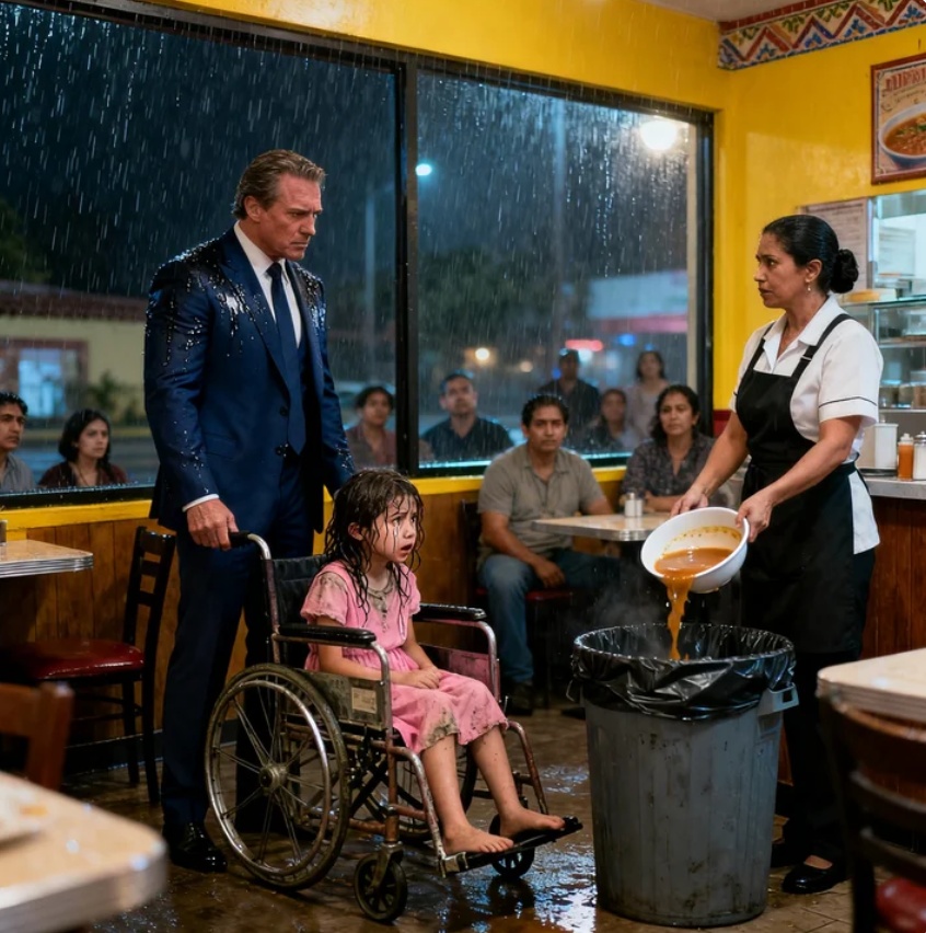 La lluvia golpeaba los ventanales del pequeño restaurante con una insistencia amarga, como si la noche entera estuviera empeñada en no dejar que nadie olvidara su tristeza. Afuera, la calle brillaba bajo los charcos y la luz de los faroles; adentro, el calor de las lámparas y el olor a comida recién hecha no alcanzaban para volver humano a todo el mundo. En una esquina, casi escondida entre las mesas, estaba Sofía, una niña de apenas seis años sentada en una vieja silla de ruedas, con el vestido rosa manchado, el cabello revuelto y esa mirada que solo tienen los niños que han llorado demasiado y, aun así, todavía esperan algo bueno.