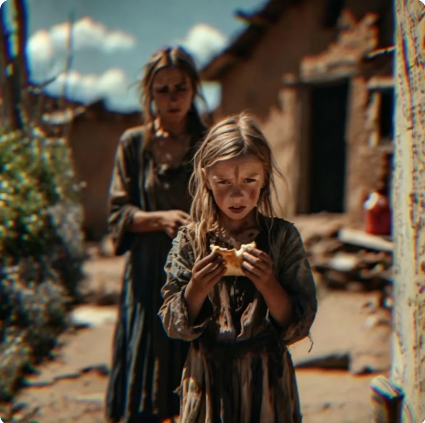 niña de ojos grandes y tristes, con el rostro manchado de lágrimas y barro,