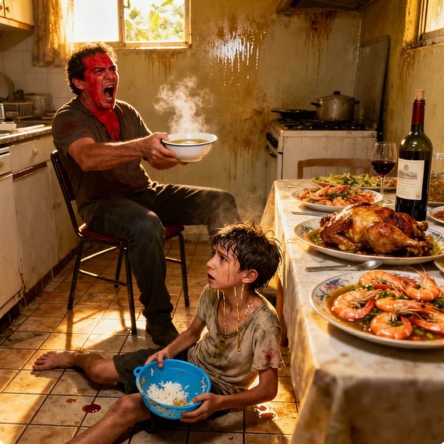 Sin previo aviso, tomó el cuenco de sopa caliente que aún humeaba sobre la mesa y lo lanzó violentamente sobre la cabeza del niño.