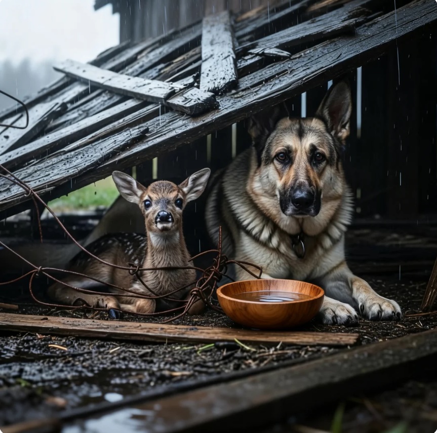Era una pequeña sierva recién nacida, con las patas enredadas en alambres oxidados, los ojos abiertos por el terror. El frío y la lluvia la habían dejado sin fuerzas. A su lado, contra todo pronóstico, había un pastor alemán.