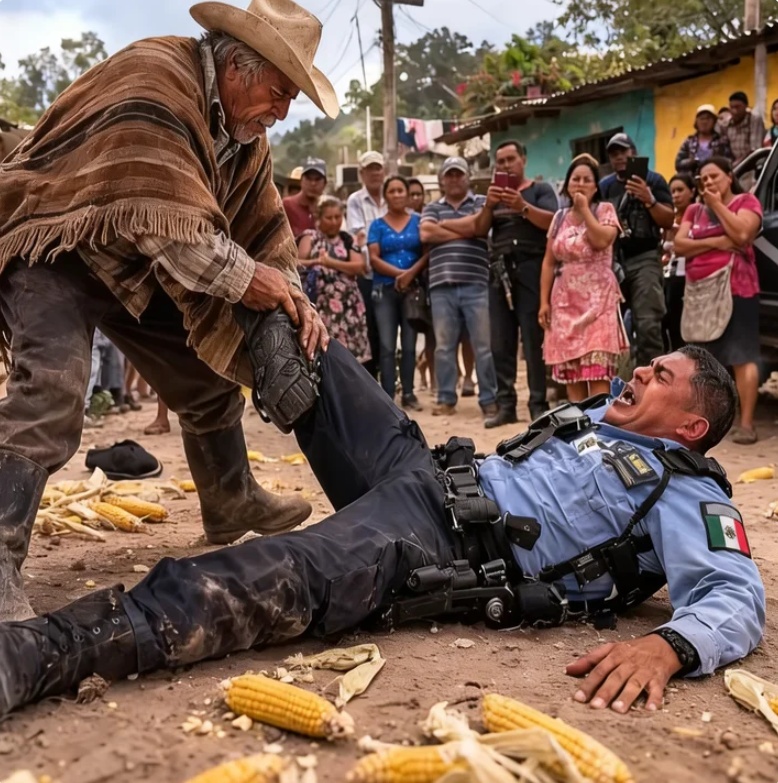 Dos policías se le fueron encima. Uno le arrancó el costal. El otro lo sujetó del brazo y lo empujó sin ninguna necesidad. El anciano intentó mantener el equilibrio, pero lo hicieron arrodillarse. El maíz se desparramó sobre el asfalto en una lluvia amarilla y humillante. Le revisaron los bolsillos, el poncho, las botas, las manos. Lo jalonearon como si buscaran un arma, droga o dinero escondido. Pero no había nada. Nada más que granos regados y dignidad golpeada.