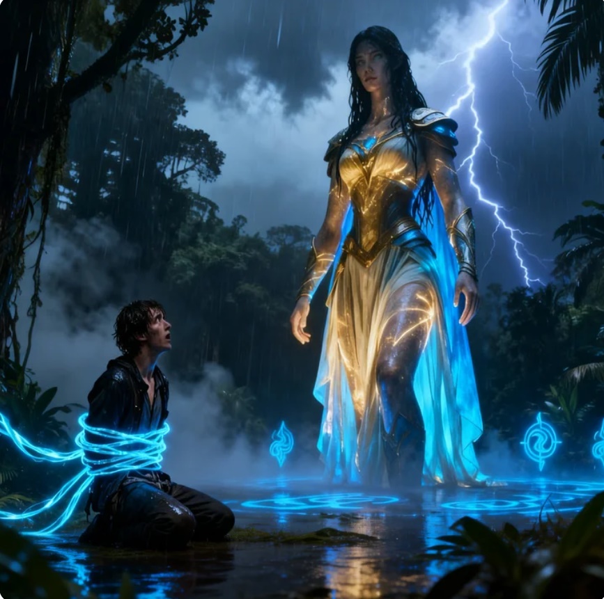 Su silueta colosal se recortaba contra la luz blanca. No era una simple gigante. Desnuda hasta los hombros, el cabello cayéndole como una cascada oscura, la piel brillando bajo la lluvia, y aquellos ojos… verdes, imposibles, casi luminosos.