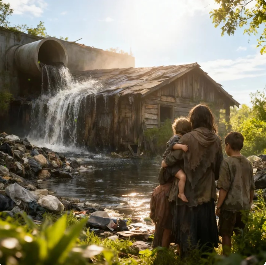un techo que parecía a punto de derrumbarse. Al lado de la casa, una tubería gruesa vertía agua sucia