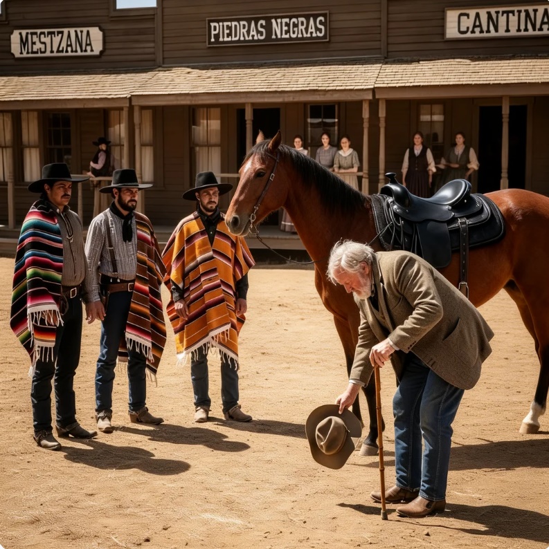 —Miren eso —dijo el más joven, tambaleándose—. Un abuelo jugando a vaquero.