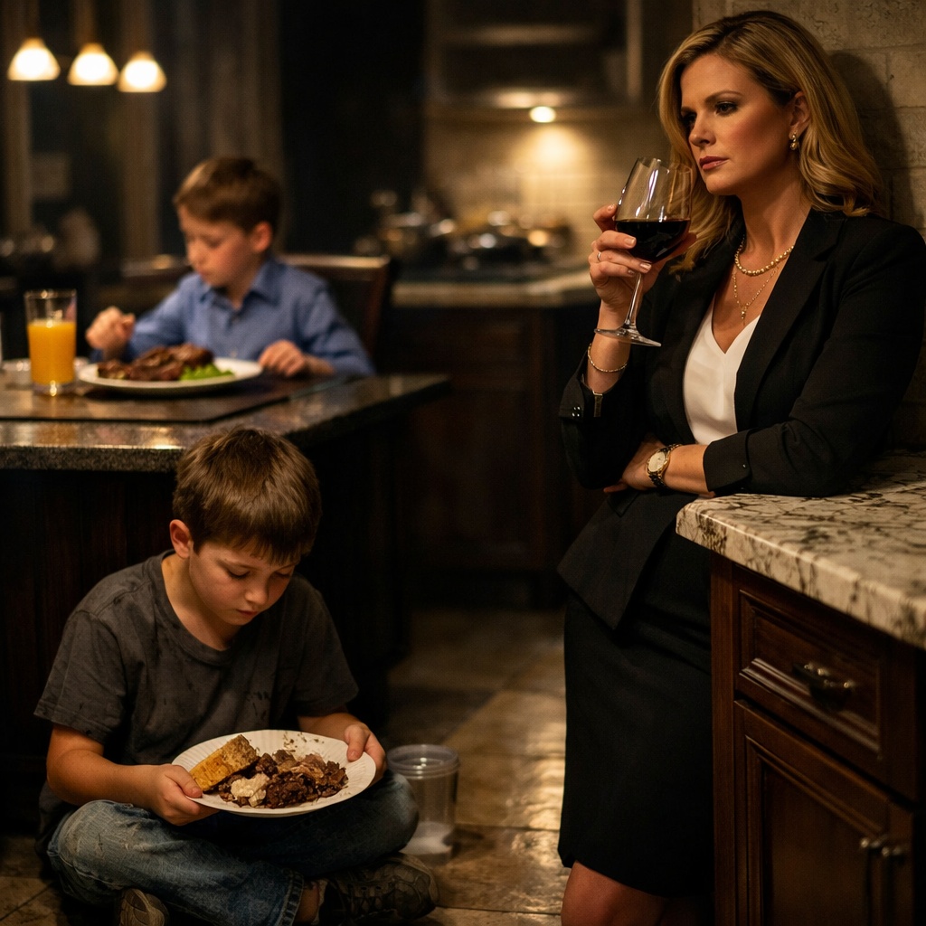 On Noah’s paper plate were the scraps—fat trimmed from Ethan’s steak, a dry piece of bread, and a plastic cup of tap water placed beside him like an afterthought.