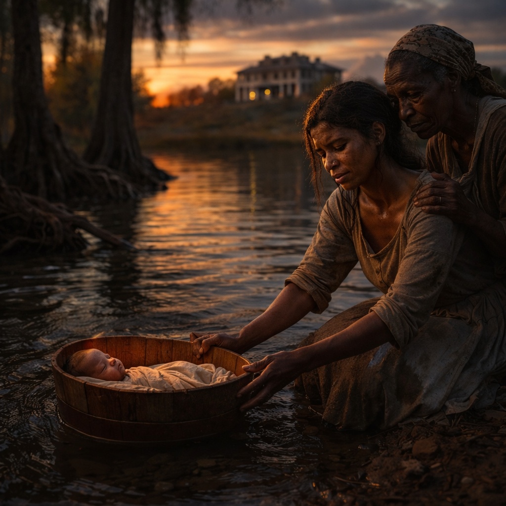 By late afternoon, she was kneeling on the bank of the Tallahatchie, an old wooden washbasin beside her and her heart split clean through. The river moved thick and brown under the fading light, carrying sticks, shadows, and the weight of things no one ever spoke aloud. Zella, the oldest woman in the slave quarters, had followed her without a word and brought broad leaves to line the basin.