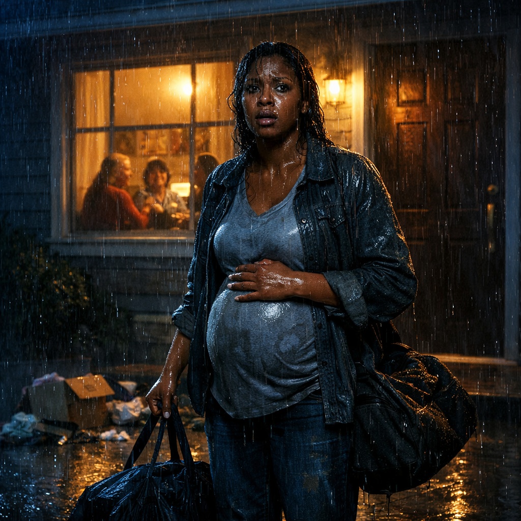 Tiana stood there in the rain, one hand on her belly, the other gripping the strap of a half-zipped duffel bag while the porch light glowed behind the curtains like nothing had happened. Like she hadn’t just been erased.