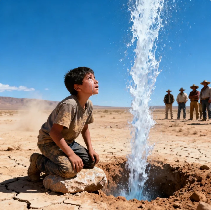 Estaba de rodillas sobre la roca, con el rostro cubierto de polvo y lágrimas, mirando el milagro que acababa de arrancar del corazón del desierto.