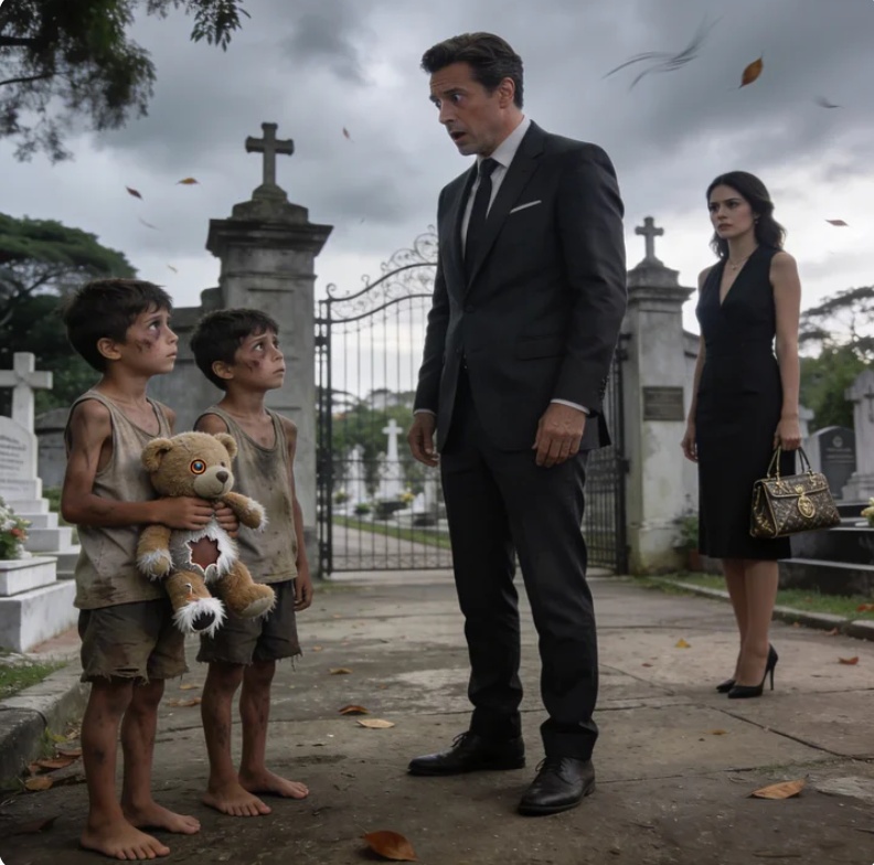 They had barely taken a few steps when two small figures appeared near the entrance. Twin boys, no older than six, thin as shadows, their clothes worn and stained by a life no child should know. One of them held out a faded teddy bear, its fur nearly gone, one eye missing.