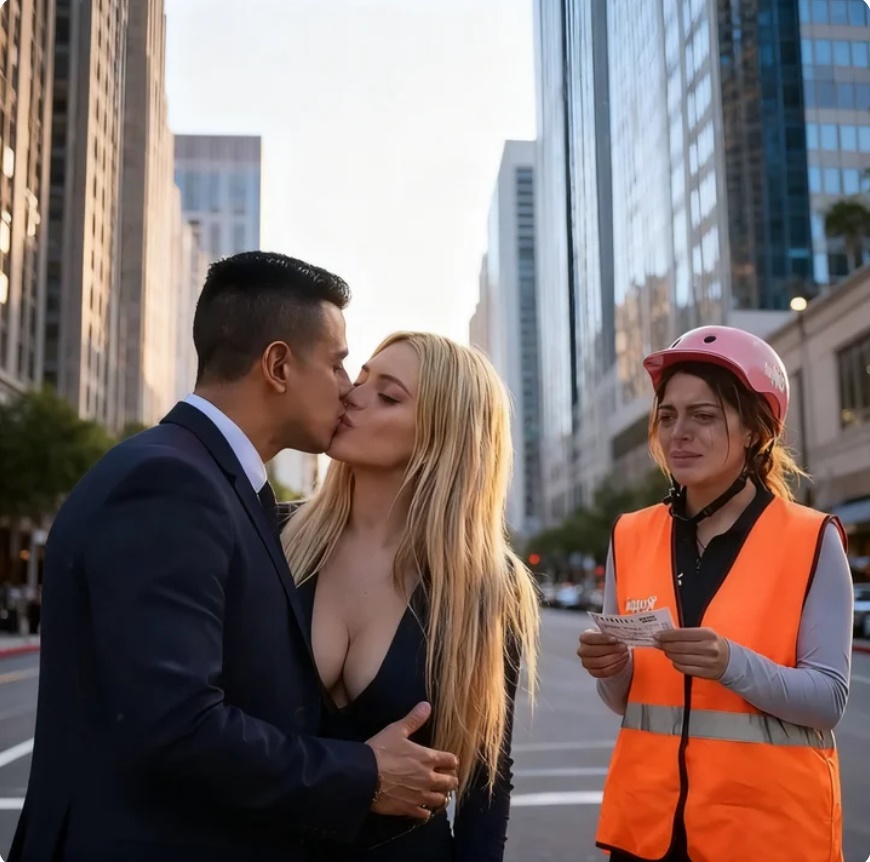 su uniforme de repartidora. El casco todavía puesto y el pedido temblando entre sus manos. Sus ojos no podían