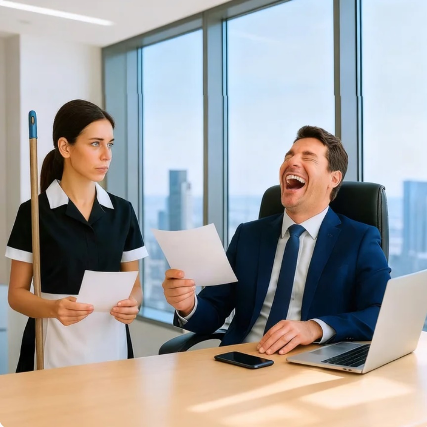 explotó en carcajadas, una mujer de la limpieza que apenas terminó la primaria,