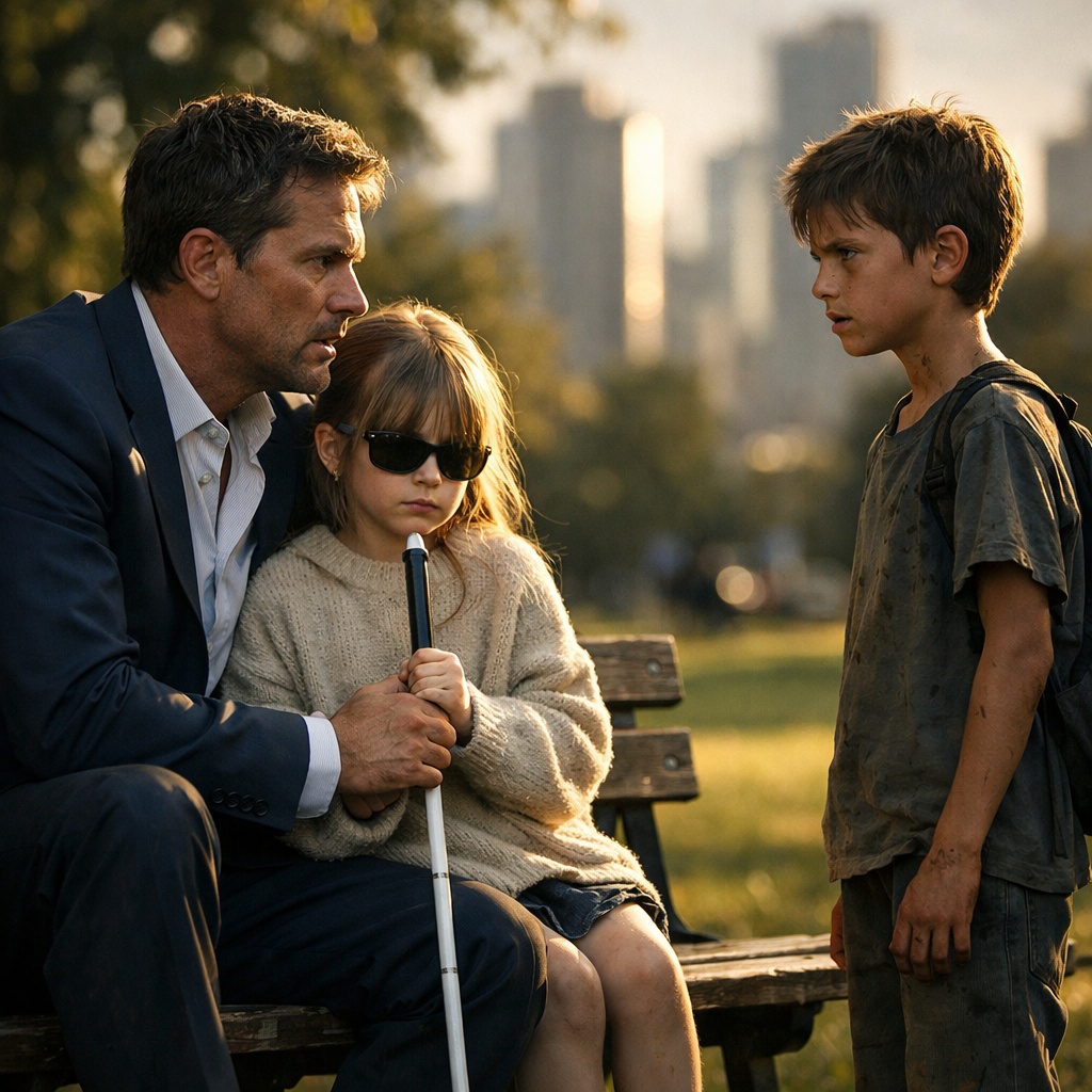 That afternoon in the small park near downtown Charlotte, the heat pressed down like a hand over the whole city. Cars hissed past the street beyond the trees. Lily sat beside him in her oversized sweater, turning her face toward the sound of pigeons.