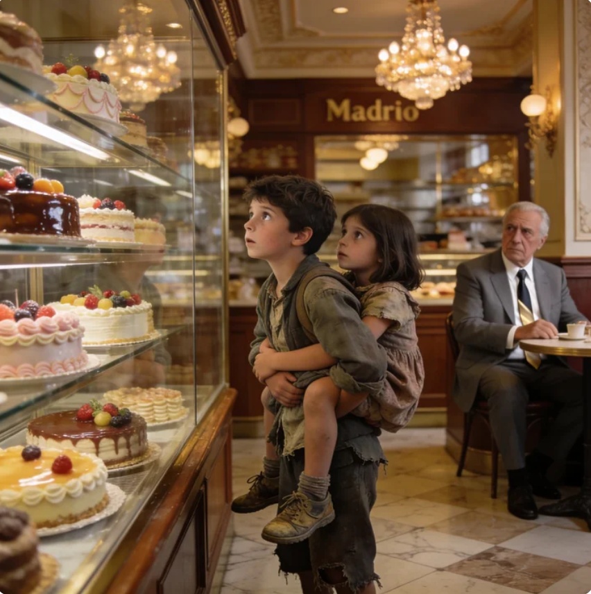 The warm scent of fresh pastries wrapped around them the moment the door closed behind them—layers of butter, sugar, and something impossibly soft. Glass displays shimmered under golden lights, filled with cakes so perfect they looked untouchable. People laughed softly over porcelain cups, unaware that, for two small children, this place might as well have been another world.