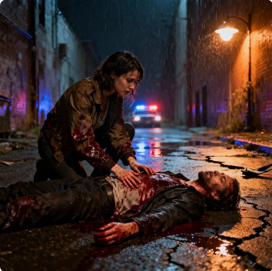word. Speak. She swallowed and forced her voice to stay steady. There’s a man who’s been shot in an alley near the