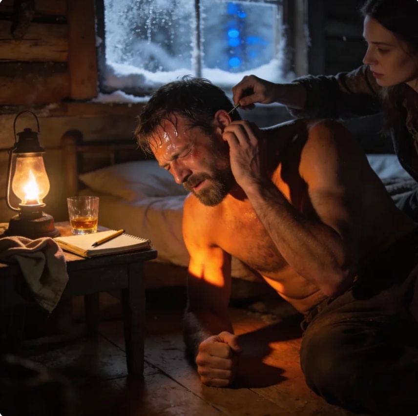 Elias sat propped against the leg of the table, breathing through clenched teeth, his face white with pain. Snow hissed softly against the windowpanes. The house felt terribly small.