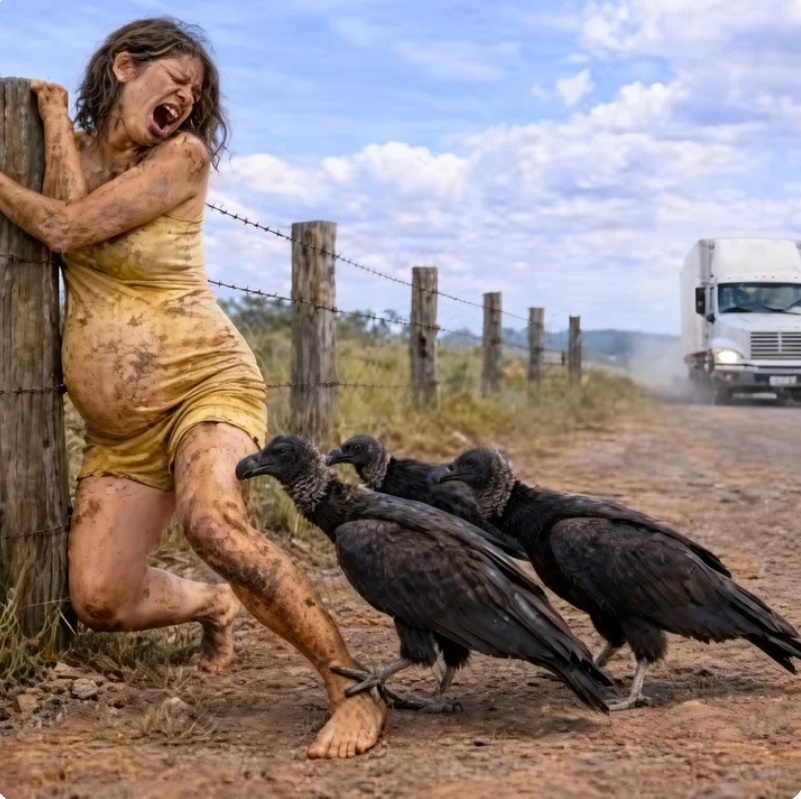 Era una mujer embarazada, sola, con el vestido pegado al cuerpo por el sudor. Su rostro estaba pálido, contraído por el dolor. Y alrededor, a cierta distancia, un grupo de buitres describía círculos lentos en el cielo, bajando cada vez más.