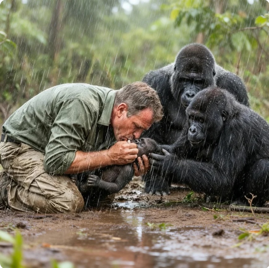 En ese momento, un hombre emergió desde la selva. Era el guardaparques Alex. Se detuvo, inmóvil. La escena ante él era imposible de olvidar: el llanto silencioso de una madre, el sufrimiento de un padre gigante, la quietud de un bebé.