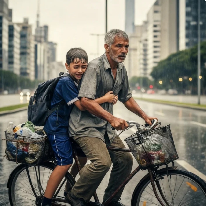 El niño vaciló al mirar la bicicleta oxidada, las bolsas llenas de reciclaje, la ropa gastada de aquel hombre desconocido. Luego miró la calle vacía, el cielo oscuro… y subió a la parte trasera sin decir nada.