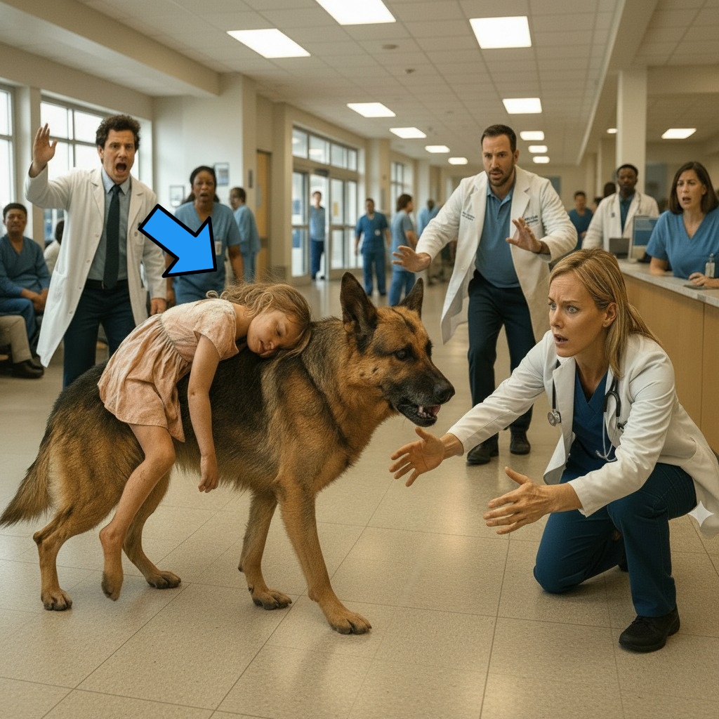 Las puertas automáticas del hospital Mercy General se abrieron de golpe con un chillido metálico, como si el edificio mismo se hubiera asustado. La gente en la sala de emergencias apenas tuvo tiempo de girar la cabeza antes de verlo: un pastor alemán empapado de sangre, con una niña inconsciente colgando de su espalda.