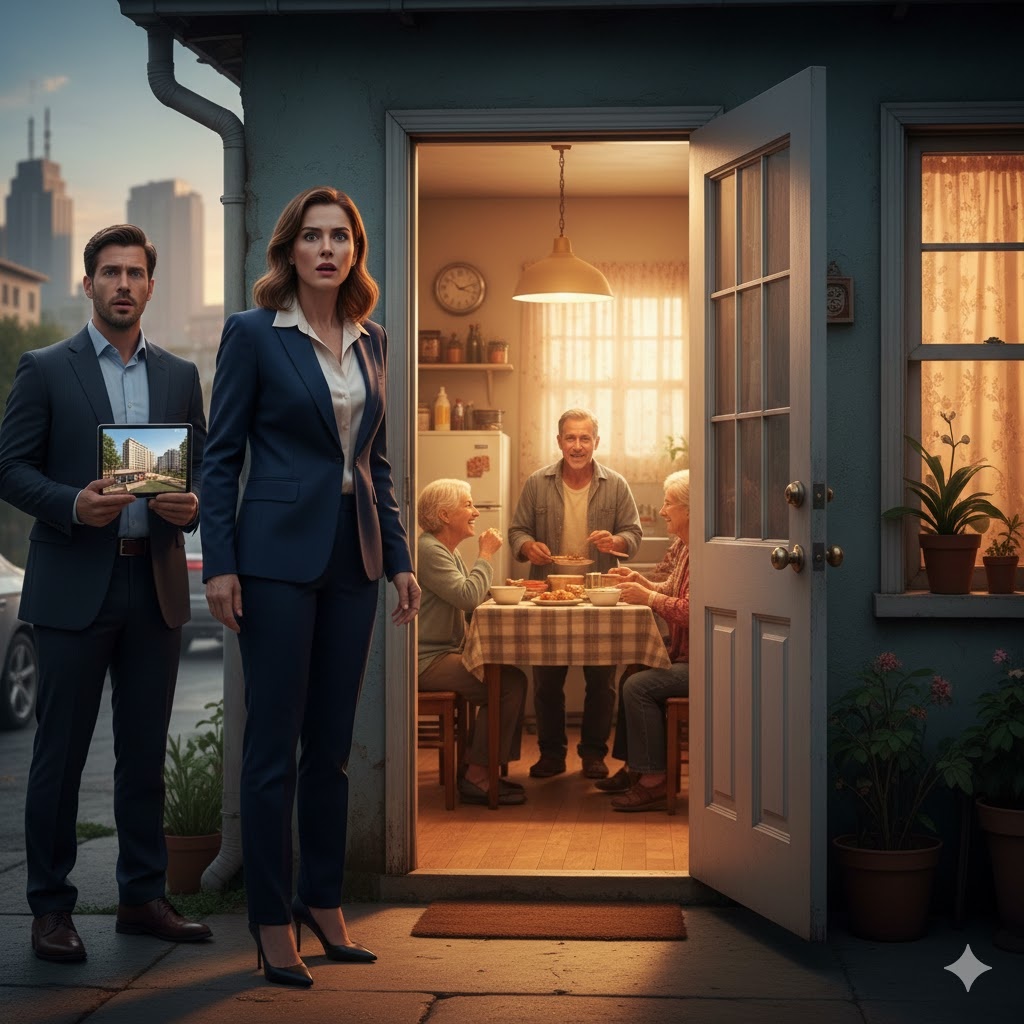 Laura bajó del coche con su traje a la medida y su reloj suizo brillando al sol. Se sintió fuera de lugar, pero lo disimuló levantando la barbilla y caminando con paso firme. Llegó hasta una vivienda azul desteñida, con una puerta de madera agrietada y el número 847 apenas visible.