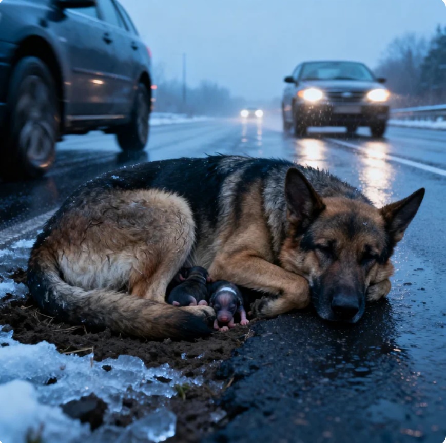 Los autos pasaban a centímetros de ella. Las llantas cortaban el asfalto mojado y los motores rugían como si el mundo entero hubiera olvidado que existía. Pero la pastora alemán no se movía. Permanecía exactamente donde estaba porque, debajo de su cuerpo, escondidos entre la tierra y el pavimento helado, estaban sus cachorros.