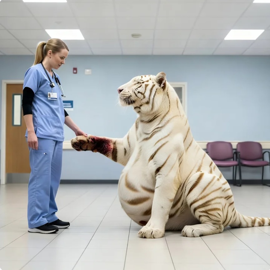 Una flecha rota sobresale de la almohadilla de… Su pata, la herida irritada e infectada. Emma cae de rodillas sin pensar. El gran felino inmediatamente baja la cabeza aún más, casi inclinándose, entregándose por completo al único humano en el que de alguna manera decidió confiar. Emma extiende la mano, con dedos temblorosos, y la apoya sobre la enorme frente del tigre. El pelaje es más suave de lo que jamás imaginó. El tigre exhala, larga y temblorosamente, y cierra los ojos. La noticia corre como la pólvora por el hospital, pero nadie llama a control de animales. Todavía no. Emma se niega a moverse. Puede sentir la fiebre quemando el cuerpo del tigre. Puede ver la ligera hinchazón de su vientre. No es solo una vida en juego. Hay cachorros dentro de ella. Dos, tal vez tres. Emma hace la llamada en ese mismo momento. Lo está haciendo ella misma. Sin tranquilizantes, sin jaulas, sin extraños. Solo ella y esta magnífica criatura que salió del desierto pidiendo ayuda. Guía al tigre, lenta y dolorosamente, hacia la sala de cirugía vacía que a veces usan para Casos de traumatismos graves.