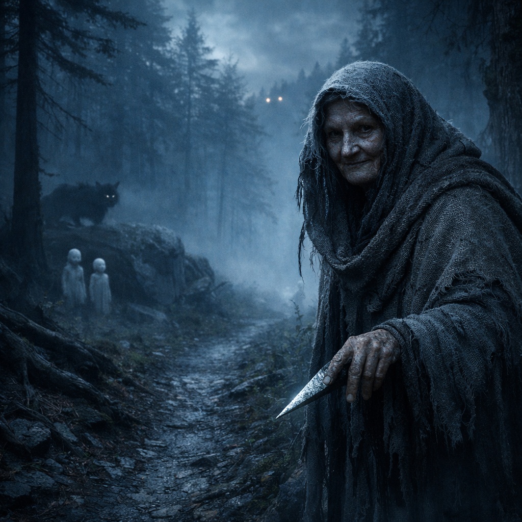 Not as a beast crashing through brush. Not as a phantom draped in shadows. She came as an old woman, bent with age, soft-spoken, slow-moving, harmless to look at until you were close enough to see what made her different. One hand ended in a long stone blade, sharp and pale as broken flint. The stories said she could mimic voices. She could call a child the way a grandmother would. She could speak your name in the tone of someone you loved. And if you stepped toward her, believing what you heard more than what you felt, you were already lost.