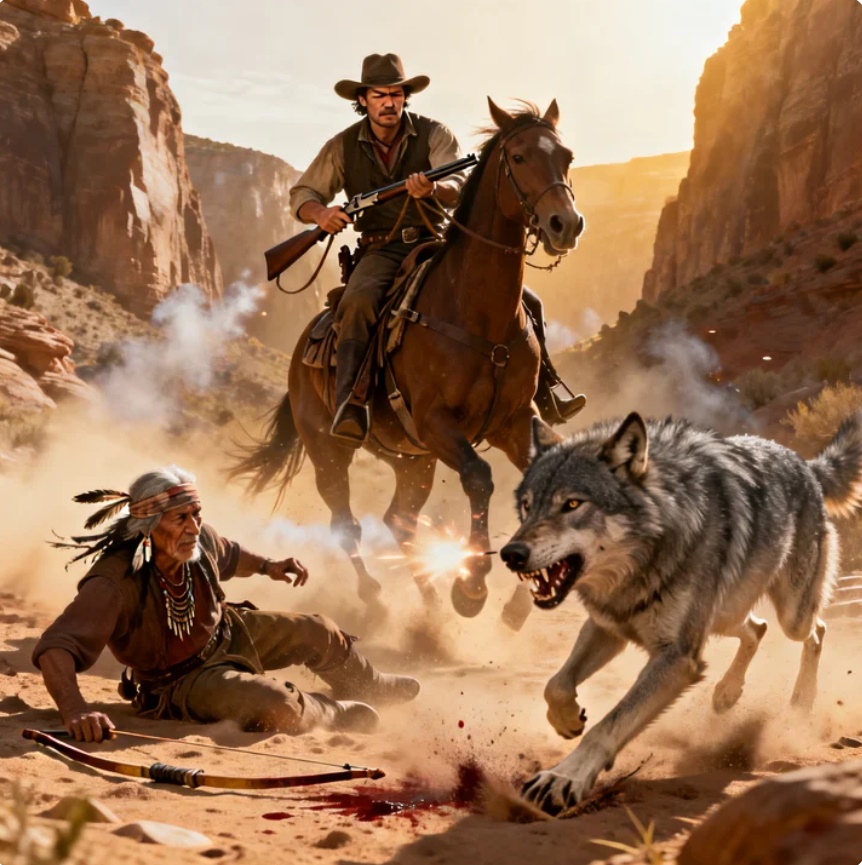 Un anciano apache luchaba por su vida contra un enorme lobo gris.