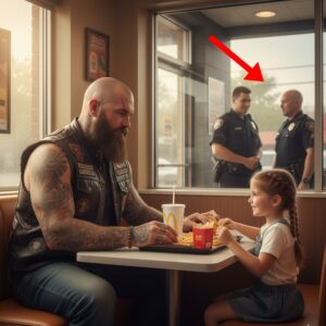 Tres oficiales de policía llegaron discretamente al restaurante, guiados por el gerente, que señalaba con la cabeza hacia el rincón. Sofía, absorta en desempacar su juguete de la Cajita Feliz, fue la primera en ver a los uniformados. Su rostro palideció, y sus ojos, generalmente llenos de alegría al lado de Lobo, se llenaron de pánico. Agarró el brazo del motociclista con sus manitas y susurró: