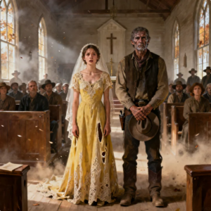 La iglesia olía a viejos himnos y juicio tranquilo. El viento frío de octubre barrió a través de las puertas abiertas, llevando susurros que envolvieron a Elanar Wade como cadenas. Ella estaba de pie en el altar en un vestido de novia prestado dos tallas también grande. Cordón amarillo colgando suelto sobre ella.