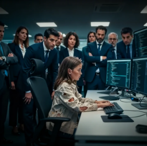 Sí, señor. Carmen Ruiz, estudio informática en la politécnica y Carmen duda, luego toma valor. Y creo que su sistema tiene un conflicto en el protocolo de seguridad que está causando un bucle infinito en los servidores principales. Los 50 ingenieros se miran entre ellos estupefactos. El director técnico, un hombre de 50 años con 20 años de experiencia, se ríe nerviosamente.