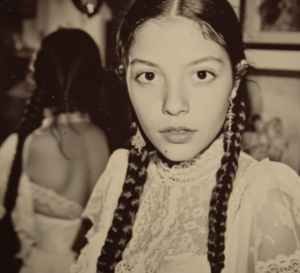 Al tomarla sintió un temblor en las manos. La tapa se abrió con un leve chasquido, revelando no el esperable mecanismo musical, sino un pequeño compartimento secreto. Dentro había un tesoro de papel, un mechón de cabello castaño atado con un listón de seda desilachado y una fotografía. La imagen borrosa y sepia mostraba a una joven de ojos grandes y profundos, con una melena ondulada enmarcando un rostro de una belleza perturbadora.