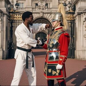Ese día, el sol apenas asomaba sobre las torres del palacio. Víctor llegó con su camarógrafo al lugar, vestido con su karategui negro ceñido al cuerpo y con el cinturón bordado con su nombre en letras doradas. Lo acompañaba un séquito de fans que lo seguía por redes, atentos a la nueva locura que estaba por transmitir en vivo. “Hoy vamos a hacer historia”, dijo al micrófono. “Voy a enseñarle a este soldadito cómo se defiende un verdadero hombre”. Se refería a Elija, el guardia real que, inmóvil y sereno, vigilaba su puesto como lo había hecho durante años.