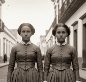 Todo comenzó con la llegada de dos hermanas a la ciudad. Nadie sabía exactamente de dónde venían, aunque algunos aseguraban haberlas visto descender de un barco procedente de España. Lo que sí era innegable era su belleza perturbadora. Ambas lucían una piel pálida como la porcelana, ojos oscuros que parecían penetrar el alma y una elegancia que contrastaba con la simplicidad de la época.
