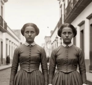 Todo comenzó con la llegada de dos hermanas a la ciudad. Nadie sabía exactamente de dónde venían, aunque algunos aseguraban haberlas visto descender de un barco procedente de España. Lo que sí era innegable era su belleza perturbadora. Ambas lucían una piel pálida como la porcelana, ojos oscuros que parecían penetrar el alma y una elegancia que contrastaba con la simplicidad de la época.