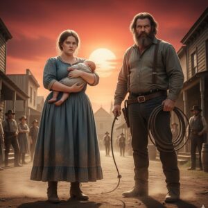 El polvo giraba en pequeños remolinos alrededor de sus botas y se posaba sobre el azul desteñido de su vestido. El niño dormía plácido, cálido, más constante que su propia respiración. Elle tenía 19 años, hombros anchos, mejillas suaves y pasos medidos. Era el tipo de mujer que aquel pueblo evaluaba primero por tamaño y después por corazón. Había aprendido a doblarse sin romperse.