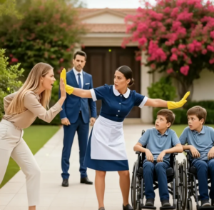 Alejandro corrió hacia el salón y la escena que presenció lo dejó helado. Camila, con el rostro deformado por la furia, tenía el brazo levantado, lista para golpear a Lucas, quien temblaba en su silla de ruedas con lágrimas rodando por sus mejillas. Pero entre ellos estaba Rosario, la niñera de 50 años, usando su propio cuerpo como escudo.