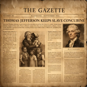 Durante un tiempo, el silencio funcionó hasta que alguien decidió [música] romperlo. En septiembre de 1802, un periodista llamado James Callender publicó [música] un artículo en un periódico de Virginia. Afirmaba que el presidente Jefferson mantenía como concubina a una esclava llamada Sally y que había tenido varios hijos con ella.