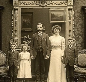 Y fue la última la que lo detuvo en seco. Una familia de cinco personas posaba en un salón opulento. Padre, rígido y solemne, con la mano apoyada sobre el respaldo de una silla, la madre, con postura perfecta, un encaje de marfil cerrándole el cuello, tres niños alineados como soldados pequeños, sin una sonrisa, sin un gesto.