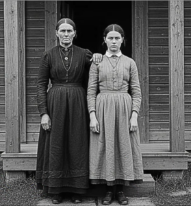 pero algo acerca de esto la hizo detenerse antes de incluso lo quitó de su protección manga. La imagen mostraba a dos mujeres. parado afuera de una modesta casa de madera. Sus expresiones serias en el camino. personas posaron para las cámaras en 1887. El Una mujer mayor, quizás de unos 40 años, llevaba un vestido oscuro sencillo con delantal blanco.