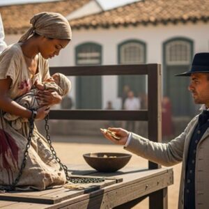 Edvar subió los escalones del escenario con pasos firmes. La madera crujió bajo sus botas. Flor no se atrevió a levantar la vista. Sabía lo que venía ahora. Siempre era lo mismo: manos ásperas, órdenes groseras, cadenas nuevas en lugares diferentes. Abrazó al bebé con más fuerza, como si pudiera fundirlo en su propio pecho y protegerlo del mundo. Cerró los ojos, esperando el tirón, el golpe.