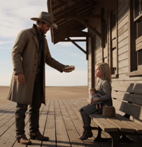 No la miró de inmediato, amarró el caballo, revisó la cincha, levantó la caja hacia un carro cercano. Entonces, por fin miró hacia el banco. Ella lo miró fijamente. Algo en esa mirada lo hizo detenerse. sacó de su bolsillo un sándwich envuelto casi intacto y se lo tendió sin decir nada. “Es de pavó”, dijo. Su voz era ronca, grave como graba bajo las botas, pero no cruel.