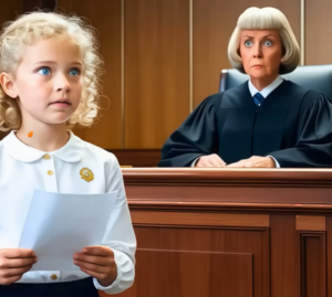 Todo parecía inclinarse a su favor,   el dinero lo cubría todo, pero la niña miró a  la jueza con determinación y pidió hablar. El   murmullo recorrió el salón. La jueza la observó  con sorpresa. Era inusual que una niña tan pequeña   pidiera declarar, pero en sus ojos había una  verdad que no podía ser ignorada. El estrado   parecía gigantesco. La niña subió con pasos  pequeños pero firmes. El murmullo cesó.