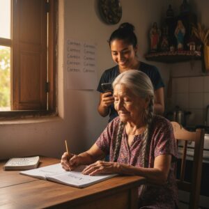 Hoy, Doña Carmen no solo firma. Escribe cartas sencillas a sus hijos que viven lejos. Hace listas para el mercado sin necesidad de memorizar. Deja notitas cariñosas a sus nietos.