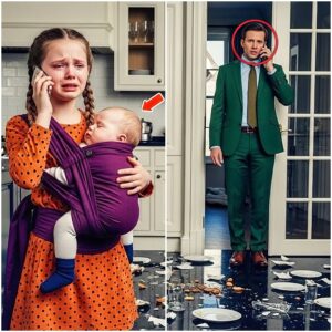 La cocina era un caos. Platos rotos por todo el suelo de mármol, comida esparcida y fragmentos de cristal brillando bajo la dura luz. Y allí, en el centro de todo, estaba Marin. Sus mejillas surcadas por las lágrimas, aferrando al bebé Noah contra su pecho con brazos temblorosos. Su pequeño vestido estaba manchado con gotas de sangre de la diminuta mano del bebé, envuelta torpemente en un paño de cocina. Sostenía el teléfono todavía presionado contra su oreja, susurrando: “Papá, lo siento. No fue mi intención”.