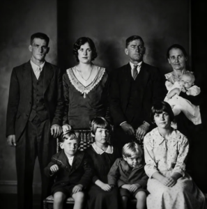 Solo mira de cerca esta fotografía. Es una imagen antigua en blanco y negro tomada en un estudio con fondo simple. La familia posa con ropa nueva y limpia. Vestidos bonitos para las niñas, trajes de lujo para los chicos. El padre está de pie atrás, serio y callado. La madre sostiene a la bebé en brazos. Delante están los hijos.