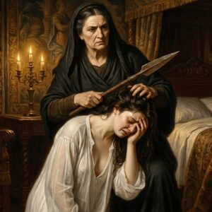 La lanza terminó su trabajo. El peinado estaba completo. Lucia se levantó, sintiendo que una parte de su alma se había quedado en ese taburete. Al mirarse en el espejo de bronce pulido, no vio a una novia radiante. Vio a una prisionera marcada. Una res lista para el mercado.