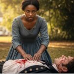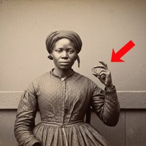 Ella estaba de pie, pero su posición en el encuadre era innegablemente inferior. Vestía un vestido simple de algodón claro, sin adornos, y mantenía las manos cruzadas frente al cuerpo. Su expresión parecía vacía, una “máscara” que Beatriz había visto en cientos de rostros de personas esclavizadas capturadas por las cámaras de aquel periodo. Sus ojos miraban al suelo, evitando la lente, evitando al amo, evitando el futuro. Ninguna sonrisa, ninguna pose ensayada; solo una presencia física obligatoria.