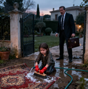 Lo que vio lo dejó completamente helado. Su pequeña hija de 8 años estaba arrodillada en el lodo frío, completamente empapada, temblando visiblemente mientras intentaba fregar una alfombra enorme. Sus manos estaban rojas, sus labios tenían un tinte azulado y estaba llorando silenciosamente mientras trabajaba.